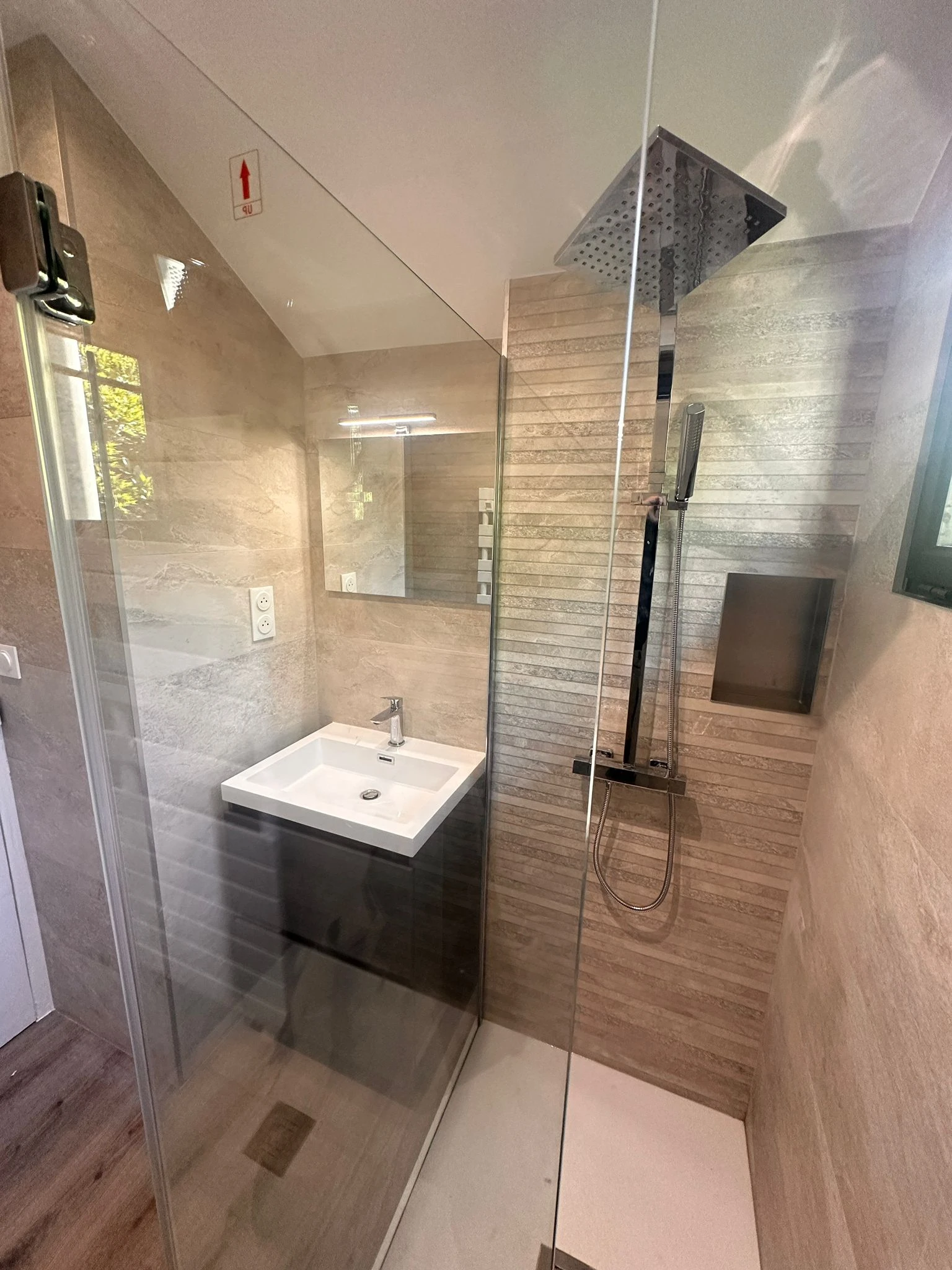 Dans le cadre de ce chantier, UNIABAT a réalisé la rénovation complète d’une salle de bain, avec pour objectif d’améliorer à la fois le confort, la fonctionnalité et la durabilité des installations existantes. L’intervention a débuté par le remplacement de la baignoire par un bac de douche, installé sur un receveur extra-plat de seulement 3 cm d’épaisseur, offrant un accès facilité et un rendu moderne et épuré.